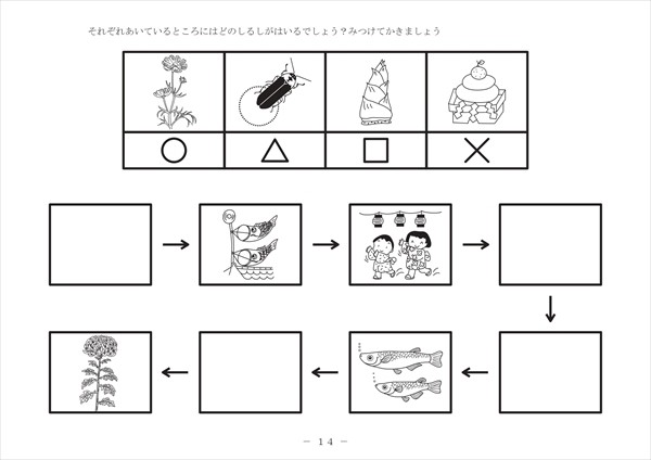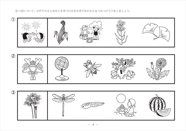 5才 1,540円(税込) 小学校受験に向けて、より実践的な練習ができる教材です。『季節』では、図形が示す季節を理解して答える問題に取り組みます。 20 季節 quantity — もしくは — カートに入れる カテゴリー 領域 知識 品番 TT-20 対象年齢 5才 Description Description 小学校受験に向けて、より実践的な練習ができる教材です。『季節』では、図形が示す季節を理解して答える問題に取り組みます。 一覧に戻る次の商品へ Related products 29 昔話 1,540円(税込) カートに入れる 6 類推 1,540円(税込) カートに入れる 37 影絵 1,540円(税込) カートに入れる 30 理科的常識1 植物・生き物 1,540円(税込) カートに入れる