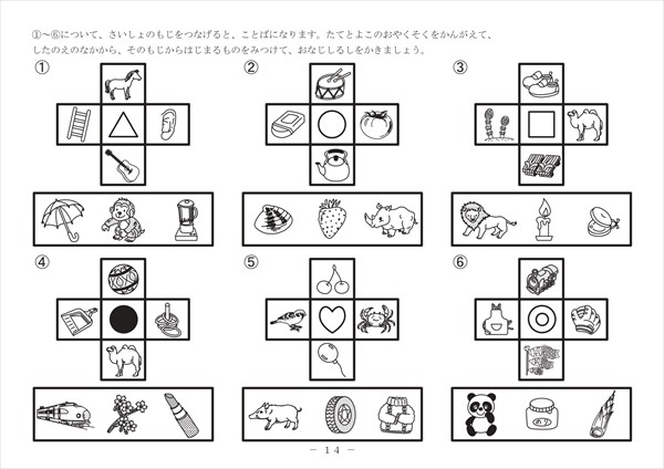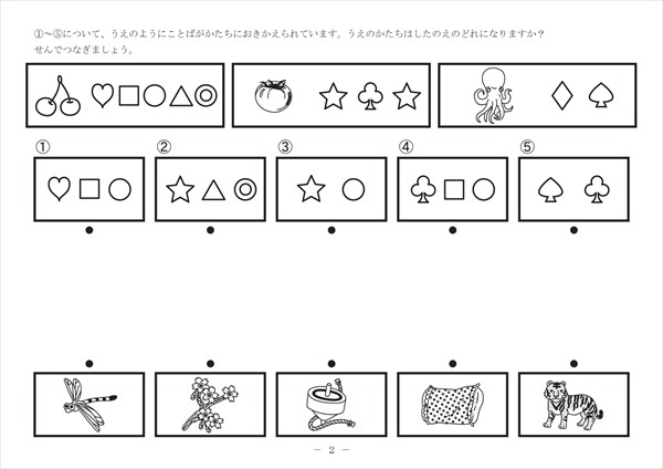 5才 1,540円(税込) 小学校受験に向けて、より実践的な練習ができる教材です。『言葉あそび』では、言葉に様々な約束事項を加えて考える問題に取り組みます。 42 言葉あそび quantity — もしくは — カートに入れる カテゴリー 領域 言語 品番 TT-42 対象年齢 5才 Description Description 小学校受験に向けて、より実践的な練習ができる教材です。『言葉あそび』では、言葉に様々な約束事項を加えて考える問題に取り組みます。 一覧に戻る次の商品へ Related products 24 系列 1,540円(税込) カートに入れる 5 つり合い 置き換え2 1,540円(税込) カートに入れる 28 様子を表す言葉 1,540円(税込) カートに入れる 36 間違い探し 1,540円(税込) カートに入れる