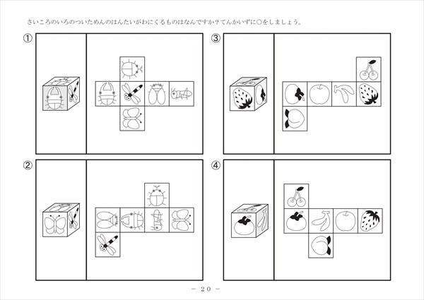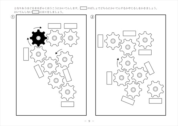 小学校受験に向けて、より実践的な練習ができる教材です。『歯車・滑車』では、回転の向きや重さ関係に気を付けて考える問題に取り組みます。『立体の展開図』では面に描かれた模様を識別して答える問題に取り組みます。