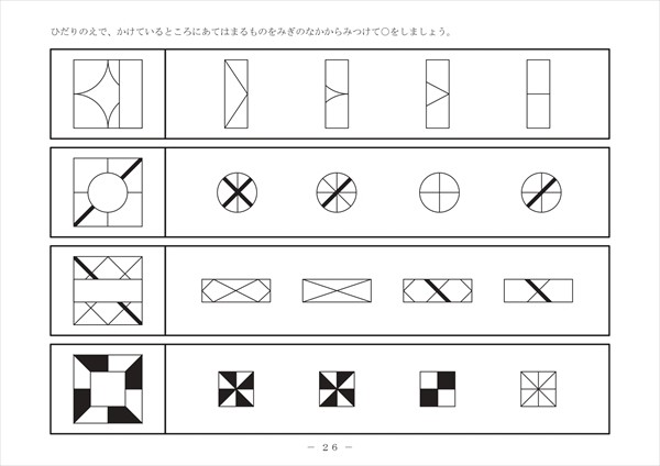 5才 1,540円(税込) 小学校受験に向けて、より実践的な練習ができる教材です。『欠所補充』では、欠けた(足りない)部分を発見し、何が入るかを考える問題に取り組みます。 9 欠所補充 quantity — もしくは — カートに入れる カテゴリー 領域 思考 品番 TT-09 対象年齢 5才 Description Description 小学校受験に向けて、より実践的な練習ができる教材です。『欠所補充』では、欠けた(足りない)部分を発見し、何が入るかを考える問題に取り組みます。 一覧に戻る次の商品へ Related products 49 推理あそび3 1,540円(税込) カートに入れる 39 四方から見た絵 1,540円(税込) カートに入れる 36 間違い探し 1,540円(税込) カートに入れる 47 道順 1,540円(税込) カートに入れる