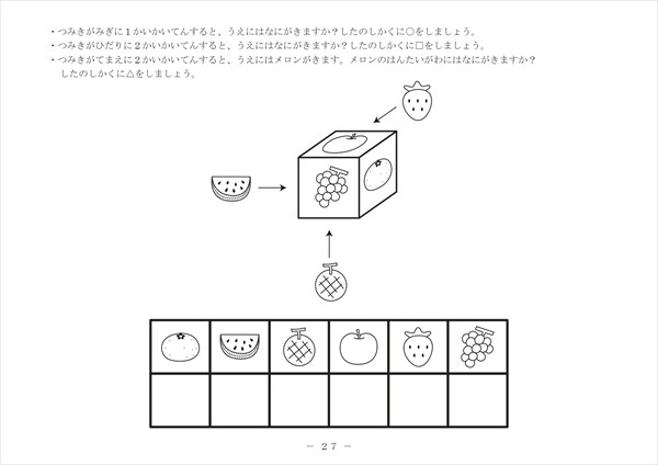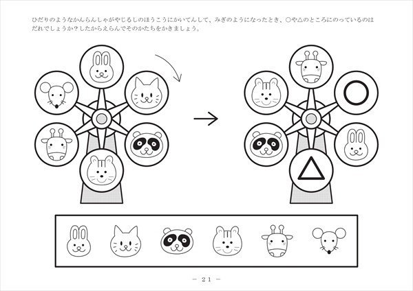 5才 1,540円(税込) 小学校受験に向けて、より実践的な練習ができる教材です。『回転・観覧車』では、図形がどのように回転するのかを考える問題に取り組みます。 25 回転・観覧車 quantity — もしくは — カートに入れる カテゴリー 領域 思考 品番 TT-25 対象年齢 5才 Description Description 小学校受験に向けて、より実践的な練習ができる教材です。『回転・観覧車』では、図形がどのように回転するのかを考える問題に取り組みます。 一覧に戻る次の商品へ Related products 43 指示の聞き取り1 1,540円(税込) カートに入れる 2 水に映った絵 1,540円(税込) カートに入れる 4 つり合い 置き換え1 1,540円(税込) カートに入れる 39 四方から見た絵 1,540円(税込) カートに入れる