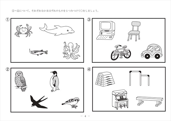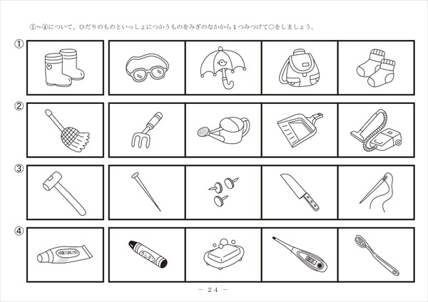 5才 1,540円(税込) 小学校受験に向けて、より実践的な練習ができる教材です。『仲間はずれ 仲間あつめ』では、ものの分類に注目して考えて答える問題に取り組みます。 52 仲間はずれ 仲間あつめ quantity — もしくは — カートに入れる カテゴリー 領域 思考 品番 TT-52 対象年齢 5才 Description Description 小学校受験に向けて、より実践的な練習ができる教材です。『仲間はずれ 仲間あつめ』では、ものの分類に注目して考えて答える問題に取り組みます。 一覧に戻る次の商品へ Related products 9 欠所補充 1,540円(税込) カートに入れる 43 指示の聞き取り1 1,540円(税込) カートに入れる 31 ローラー・転がし図形 1,540円(税込) カートに入れる 7 2つ折り 4つ折り 1,540円(税込) カートに入れる