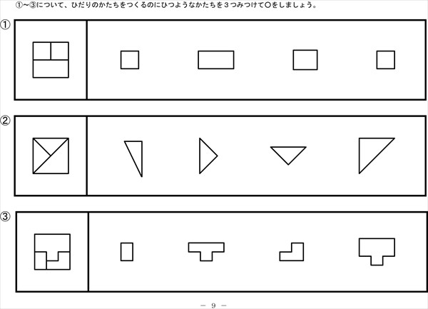 4才 5才 1,540円(税込) 小学校受験に向けて、楽しく学びを深められる教材です。『図形の分割(3分割)』では、3つの図形の合わせ方について考える問題に取り組みます。 14 図形の分割(3分割) quantity — もしくは — カートに入れる カテゴリー 領域 図形構成 品番 NT-14 対象年齢 4才以上 Description Description 小学校受験に向けて、楽しく学びを深められる教材です。『図形の分割(3分割)』では、3つの図形の合わせ方について考える問題に取り組みます。 一覧に戻る次の商品へ Related products 20 見る記憶 1,540円(税込) カートに入れる 16 選択抹消 1,540円(税込) カートに入れる 【レベル1】はじめてのTAMワーク(年中児~新年長児 向け) 全93頁 3,300円(税込) カートに入れる 12 切り抜き図形 1,540円(税込) カートに入れる