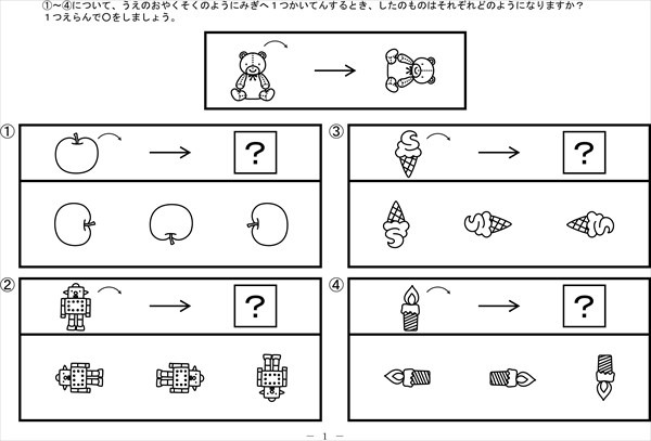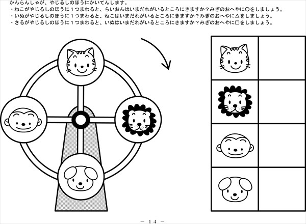 4才 5才 1,540円(税込) 小学校受験に向けて、楽しく学びを深められる教材です。『回転・観覧車』では、図形がどのように回転するのかを考える問題に取り組みます。 3 回転・観覧車 quantity — もしくは — カートに入れる カテゴリー 領域 思考 品番 NT-03 対象年齢 4才以上 Description Description 小学校受験に向けて、楽しく学びを深められる教材です。『回転・観覧車』では、図形がどのように回転するのかを考える問題に取り組みます。 一覧に戻る次の商品へ Related products 5 置き換え 1,540円(税込) カートに入れる 9 しりとり 1,540円(税込) カートに入れる 20 見る記憶 1,540円(税込) カートに入れる 16 選択抹消 1,540円(税込) カートに入れる